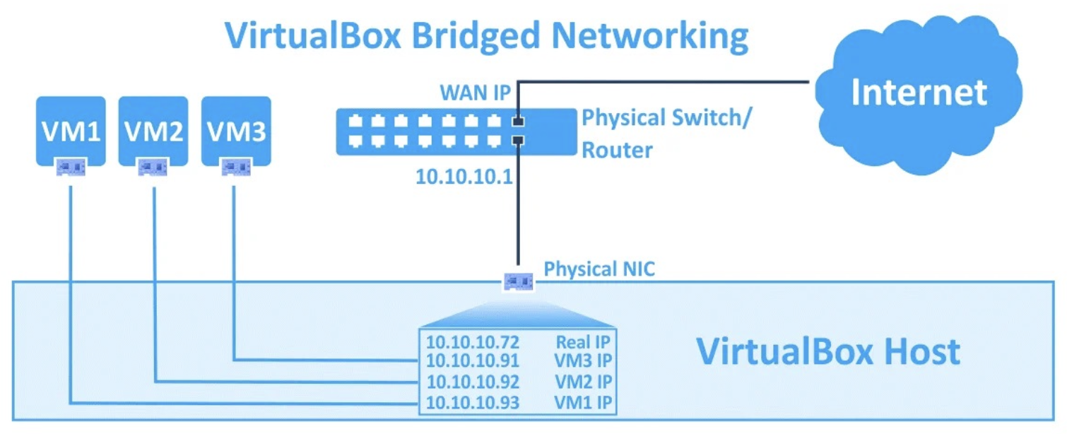 La modalità bridge di rete è usata quando si vuole connettere un adattatore di rete virtuale di una macchina virtuale all’adattatore fisico di rete a cui la macchina host è collegata; in questo modo, la macchina virtuale sfrutterà la rete dell’host e i pacchetti saranno inviati e ricevuti direttamente dall’adattatore virtuale, senza altro routing. Ciò diventa possibile grazie all’uso di un driver che filtra i pacchetti ricevuti dall’host e diretti alla macchina virtuale. Questa modalità di rete si usa tipicamente quando si eseguono dei server in delle macchine virtuali che devono essere completamente accessibili dalla LAN fisica; resta possibile accedere a macchine della rete fisica e anche reti esterne dalla macchina virtuale, rimanendo raggiungibili sia dall’host che da altri host e macchine virtuali collegati alla stessa rete fisica.