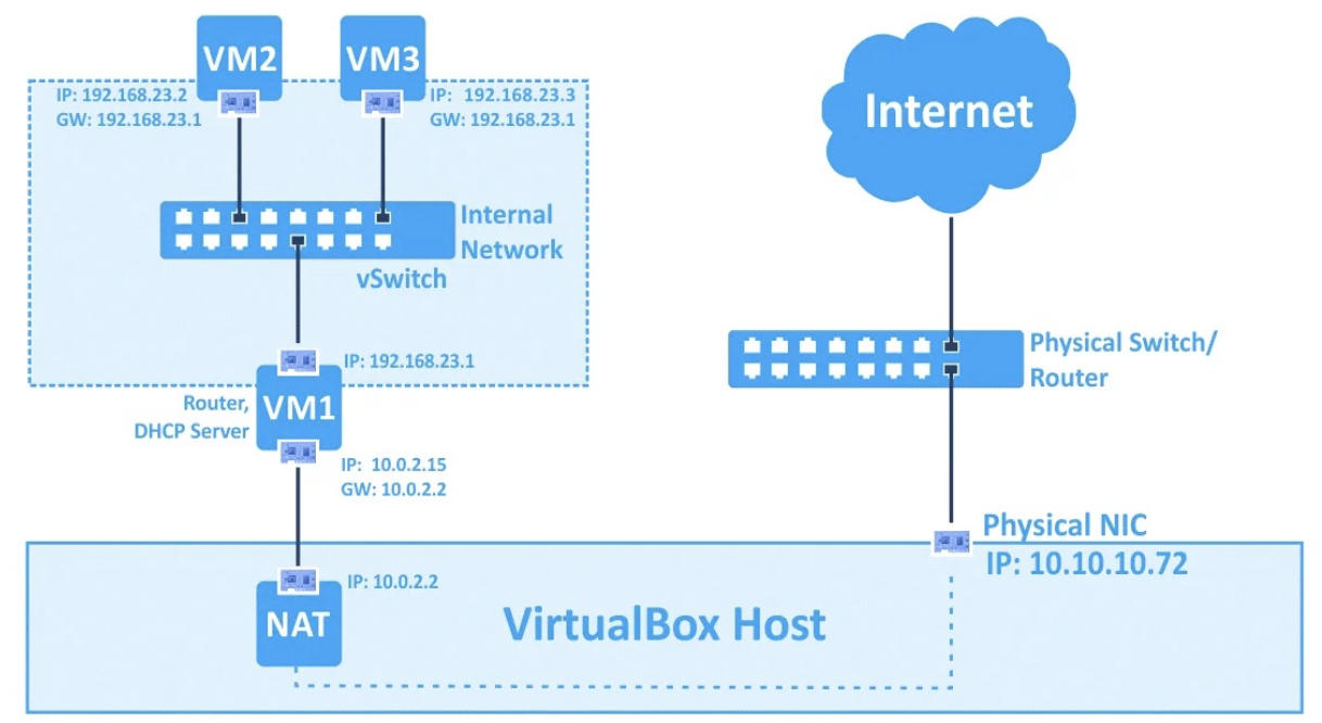 In questa modalità, le schede di rete delle macchine virtuali sono collegate ad una rete virtuale ed isolata. Le VM collegate a questa rete possono dialogare tra di loro, ma non possono comunicare con l’host, con altri host nella rete fisica o con reti esterne e non sono nemmeno raggiungibili, né dall’host, né da altri dispositivi.