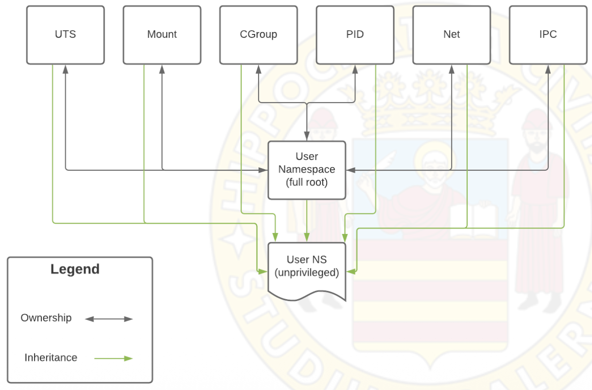 Lo user namespace governa tutti i namespace: le capabilities di un namespace sono direttamente correlate alle capabilities del suo user namespace genitore. L’originale e root user namespace possiede tutti i namespace su un sistema.