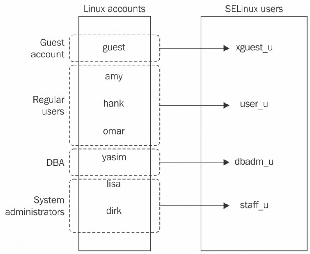Le definizioni degli utenti SELinux restringono anche quali ruoli un utente Linux può assumere. Un utente Linux viene prima assegnato ad un utente SELinux, che non deve necessariamente essere unico; più utenti Linux possono essere assegnati allo stesso utente SELinux. Una volta definito, quell’utente non può passare ad un ruolo SELinux non associato a quell’utente SELinux.