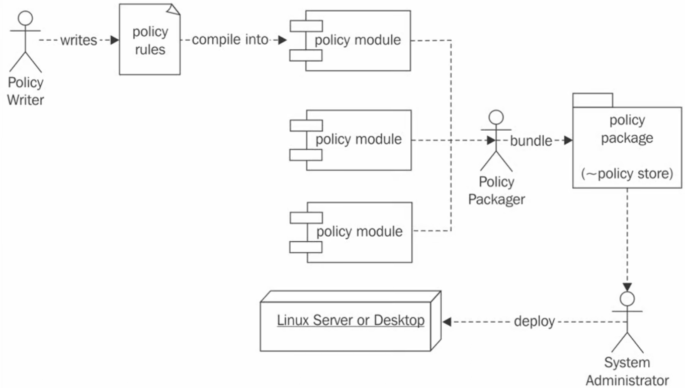 Le politiche di SELinux sono generalmente distribuite in una forma compilata, i policy modules, che sono poi aggregati in un singolo policy store e caricati in memoria per permettere a SELinux di applicare le regole all’interno del sistema.