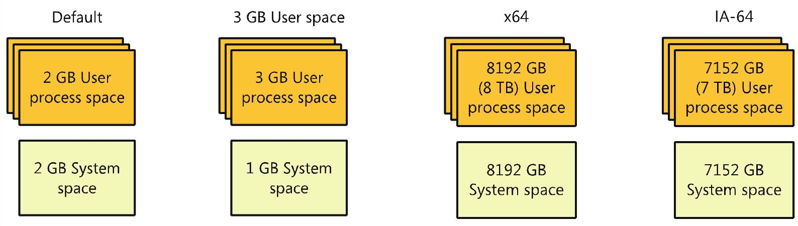 Di default, Windows alloca la metà più bassa dello spazio degli indirizzi ai processi per il loro storage privato (da 0x00000000 a 0x7FFFFFFF) e la metà superiore per la memoria protetta dell’OS (da 0x80000000 a 0xFFFFFFFF). Windows supporta le operazioni a boot time, come il qualifierIncreaseUserVa nel Boot Configuration Database, per dare ai processi che eseguono programmi segnati in modo apposito la possibilità di usare fino a 3 GB di spazio degli indirizzi privato, lasciando 1 GB all’OS[ ^notaSpazio].