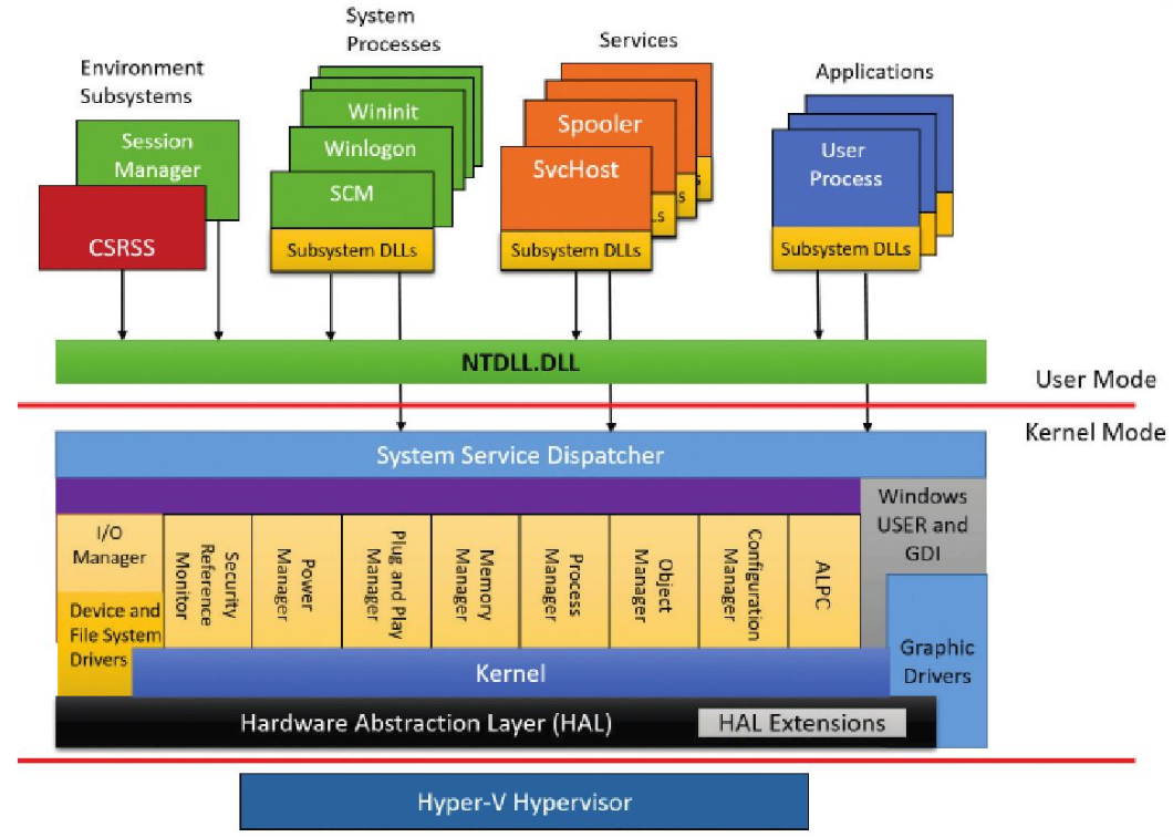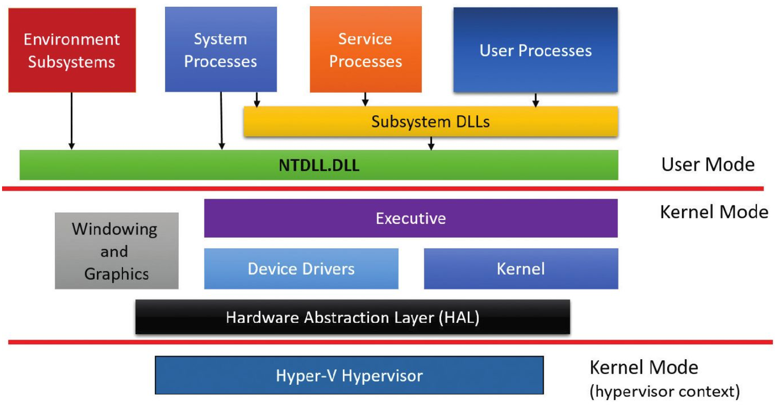 Le applicazioni utente sono eseguite in user mode, mentre il codice dell’OS (eg. servizi di sistema e driver per i dispositivi) sono eseguiti in kernel mode, una modalità di esecuzione in un processore che permette l’acceso alla memoria del sistema e tutte le istruzioni della CPU stessa.