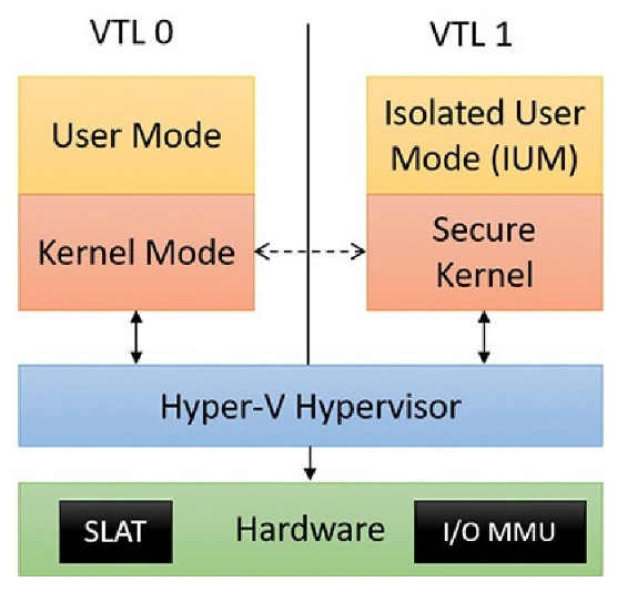 Nella pratica, il codice utente e kernel viene eseguito sull’hypervisor Hyper-V. Con VBS abilitato, un VTL1 è presente e contiene il proprio kernel sicuro, in esecuzione nella modalità privilegiata del processore. Una modalità di ambiente per l’utente runtime, detta Isolated User Mode (IUM) è eseguita in maniera non privilegiata. Il kernel sicuro possiede il proprio binario separato (securekernel.exe).